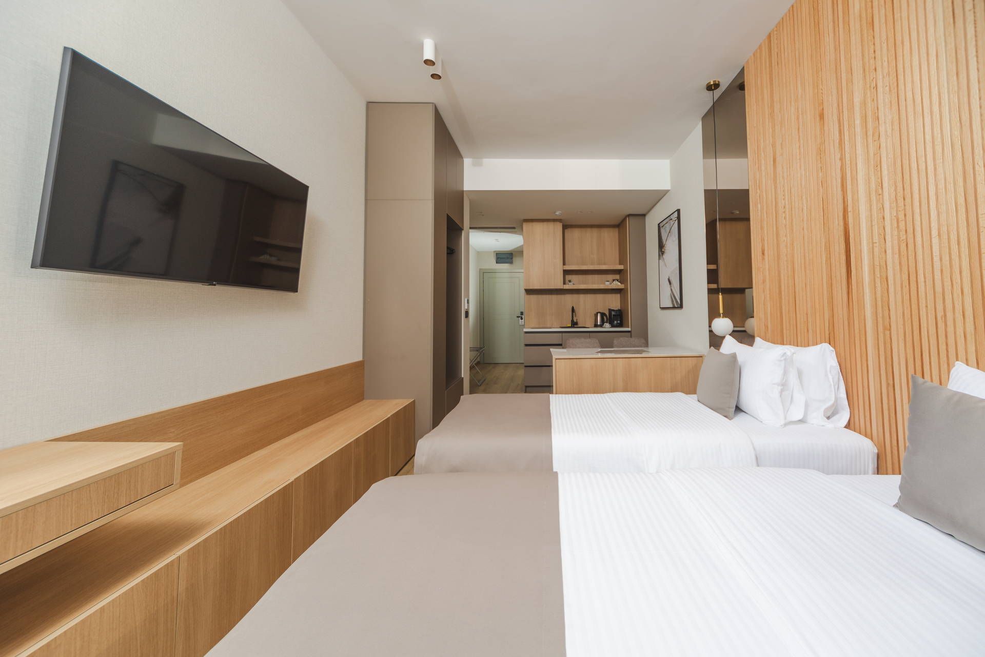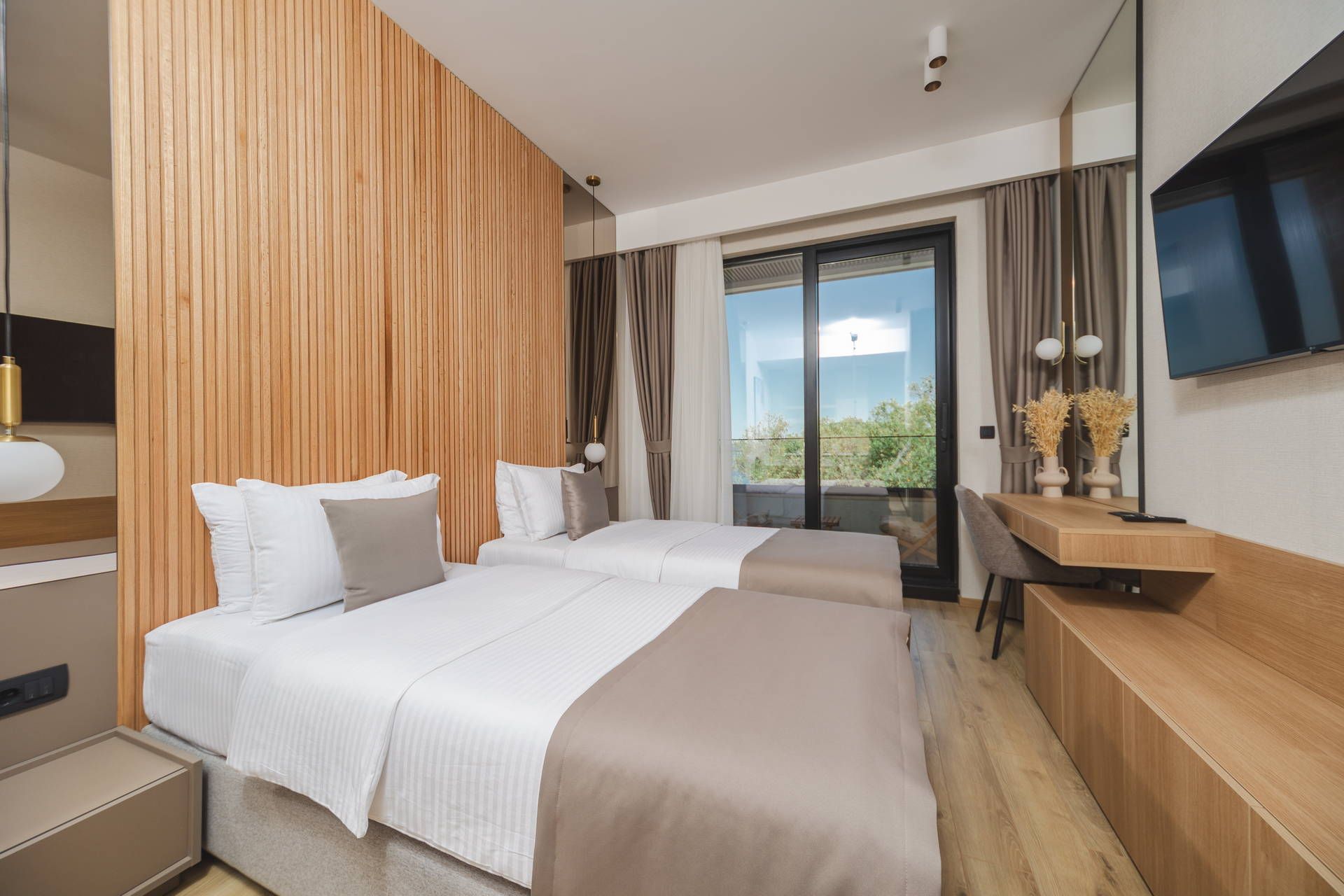 Each room is equipped with two separate beds, a sitting area and a balcony with a table and chairs.